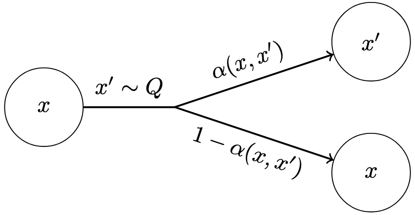 - Starting from the current state $x$, a new state $x'$ is drawn from the proposal distribution $Q\left(x,X'\right)$.